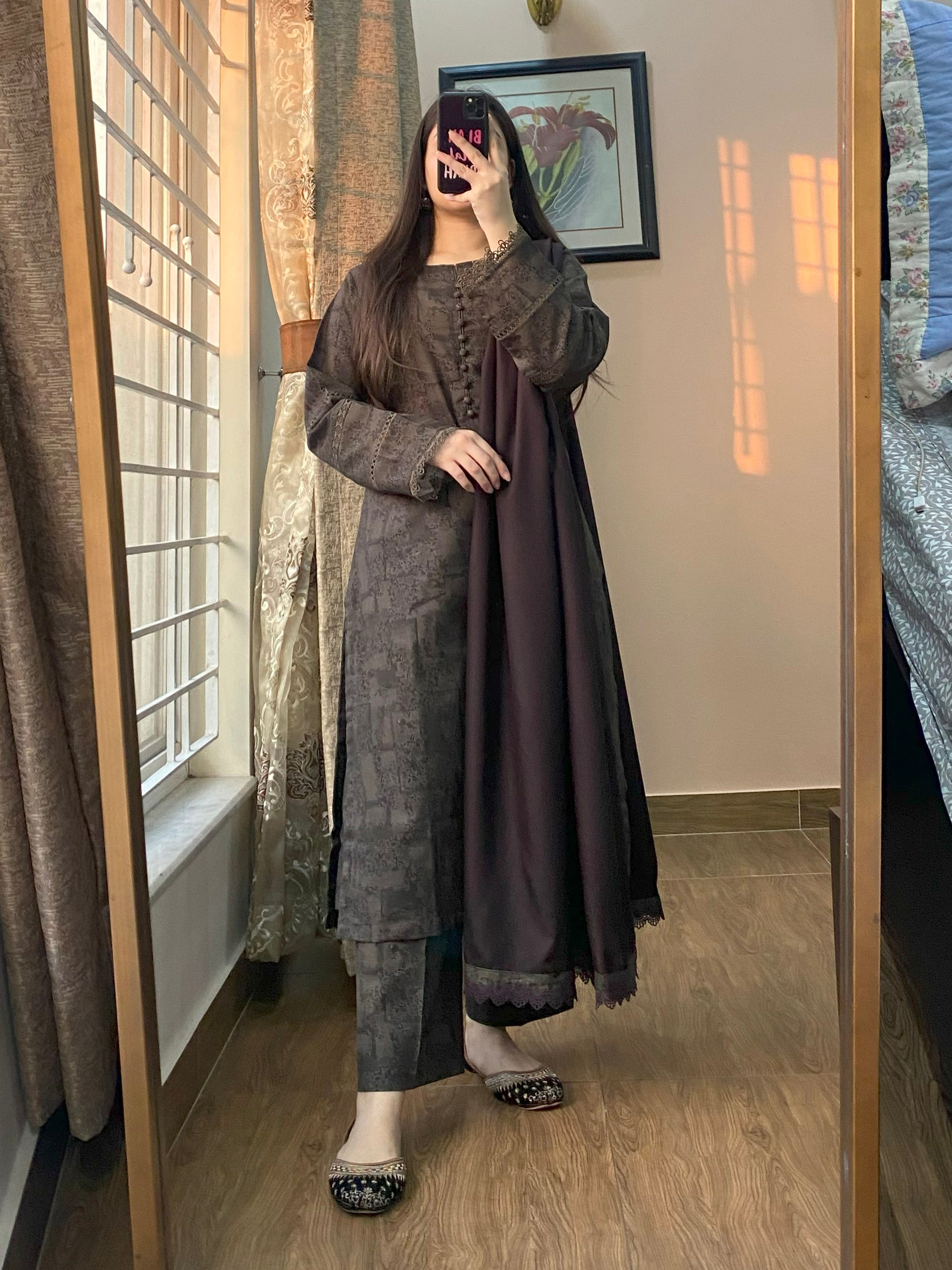 Elevate your winter wardrobe with this beautifully coordinated ensemble. The Premium Slub Khaddar Printed Shirt features intricate lacework detailing on the sleeves and neckline, offering a touch of refined sophistication. Paired with Straight-fit Premium Slub Khaddar trousers, it delivers a sleek, flattering silhouette for the perfect balance of style and comfort. The Dhanak Lace Work Shawl completes the look, adding an extra layer of warmth and elegance.